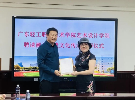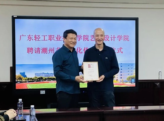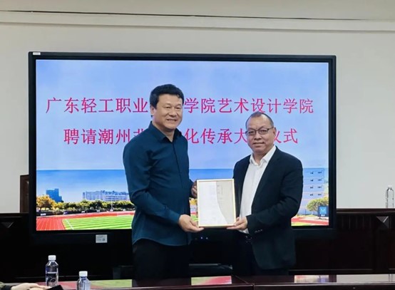 非遗文化传承大师客座教授聘任仪式。国家级非物质文化遗产,潮州手拉壶世家“俊合号”第五代传人——中国工艺美术大师谢华、“东潮木雕艺术流派”创立者,正高级雕刻工艺美术师——中国工艺美术大师李中庆、和国家高级工艺美术师,广东省潮州抽纱刺绣技艺传承人——中国刺绣艺术大师祝书琴等三位潮州地区代表性大师被聘为广东轻工职业技术学院艺术设计学院的客座教授。