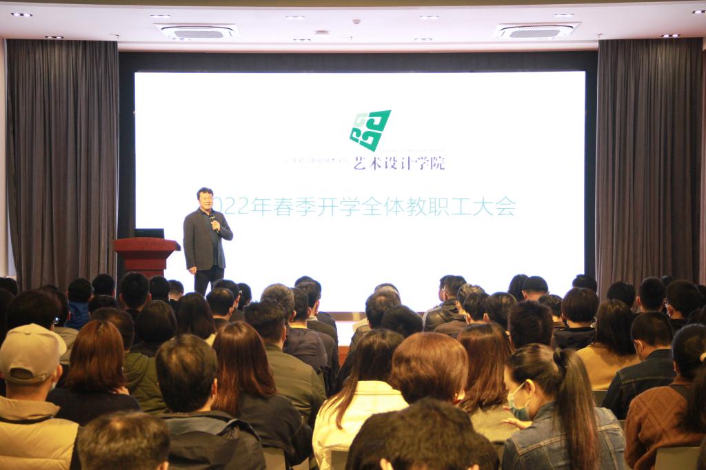 参观学习结束后,全体教职工大会正式开始。桂元龙院长以《聚焦标志性成果 做活产教科融合》为题作了2022年春季开学工作报告。他简要回顾了我院在寒假期间各方面工作的情况,分析了本年度面临的诸如生源多元化带来学生素质变化、现有模式制约产教科融合发展、层次思维对纵向贯通的不适应等方面的问题,将锁定双高任务产出标志性成果、聚焦“双高”神韵促进产教科融合、落实三教改革推动工学商一体、加强国际协作拓展互动新路径、全方位梳理资源迎接本科办学等五方面作为今后的重点工作。他希望广大教职工继续保持进取、奉献的精神,为打造“中国特色·世界一流”的设计学院品牌贡献力量。