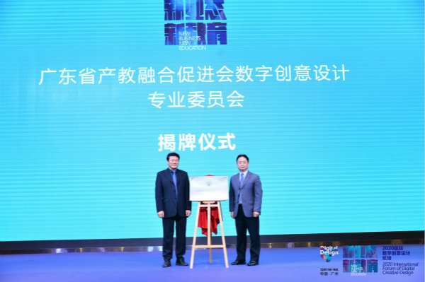 大会现场还隆重举行了广东省产教融合促进会数字创意设计专业委员会的成立仪式,广东省教育厅国际港澳台交流处处长李金俊与广东省产教融合促进会数字创意设计专业委员会主任委员桂元龙共同为广东省产教融合数字创意设计专业委员会揭牌,并进行了主任委员、副主任委员、委员的聘书颁发仪式。